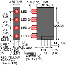 | 41PCT170T4-0018 (41PCT170T4-R/G/G/G 6R) LEDS Top to Bottom: Red/Green/Green/Green | 500 | 20 | 2.0/2.8 | 30 | -40ºC ~+74ºC | 635nm | | 45° | ||